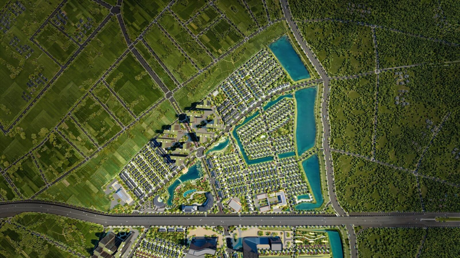Quy mô: ~55ha. Loại hình: Thấp tầng: Biệt thự đơn lập, Song lập, Shophouse (Kiến trúc Tân cổ điển Châu Âu). Cao tầng: 9 tòa tháp căn hộ (Kiến trúc kính Low-E tràn viền). Điểm nhấn đắt giá: Dẫn nguồn khoáng nóng vào từng căn biệt thự & tiện ích Onsen 5 sao.